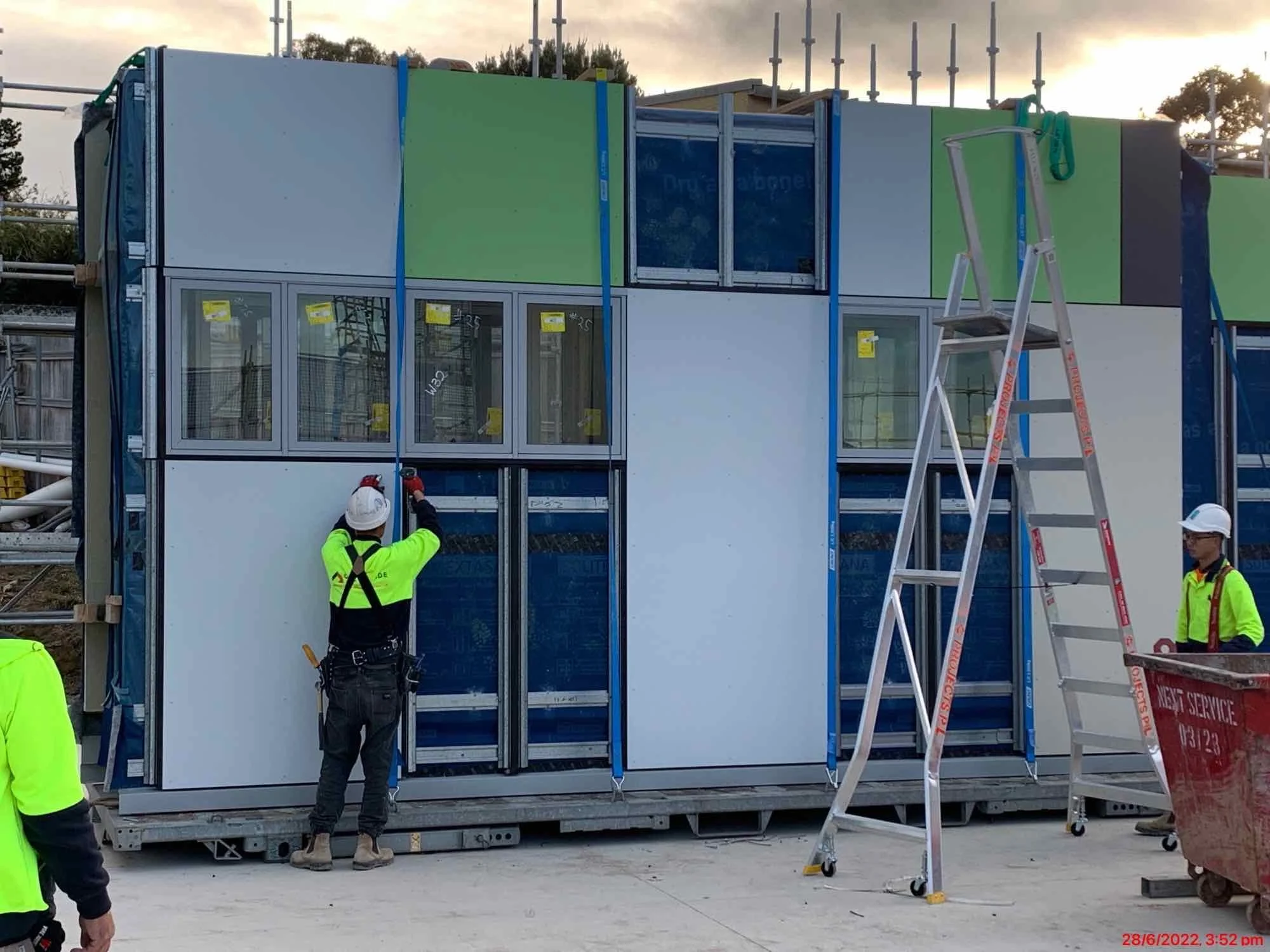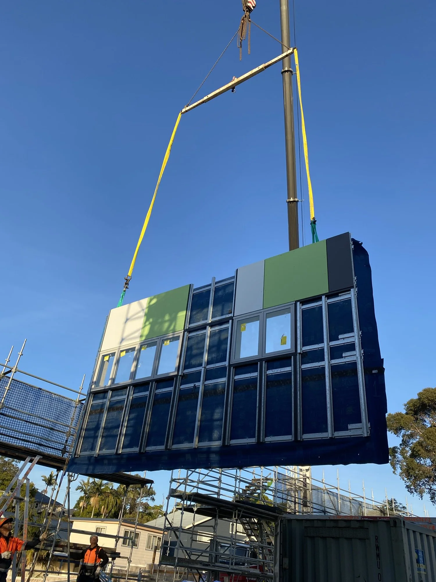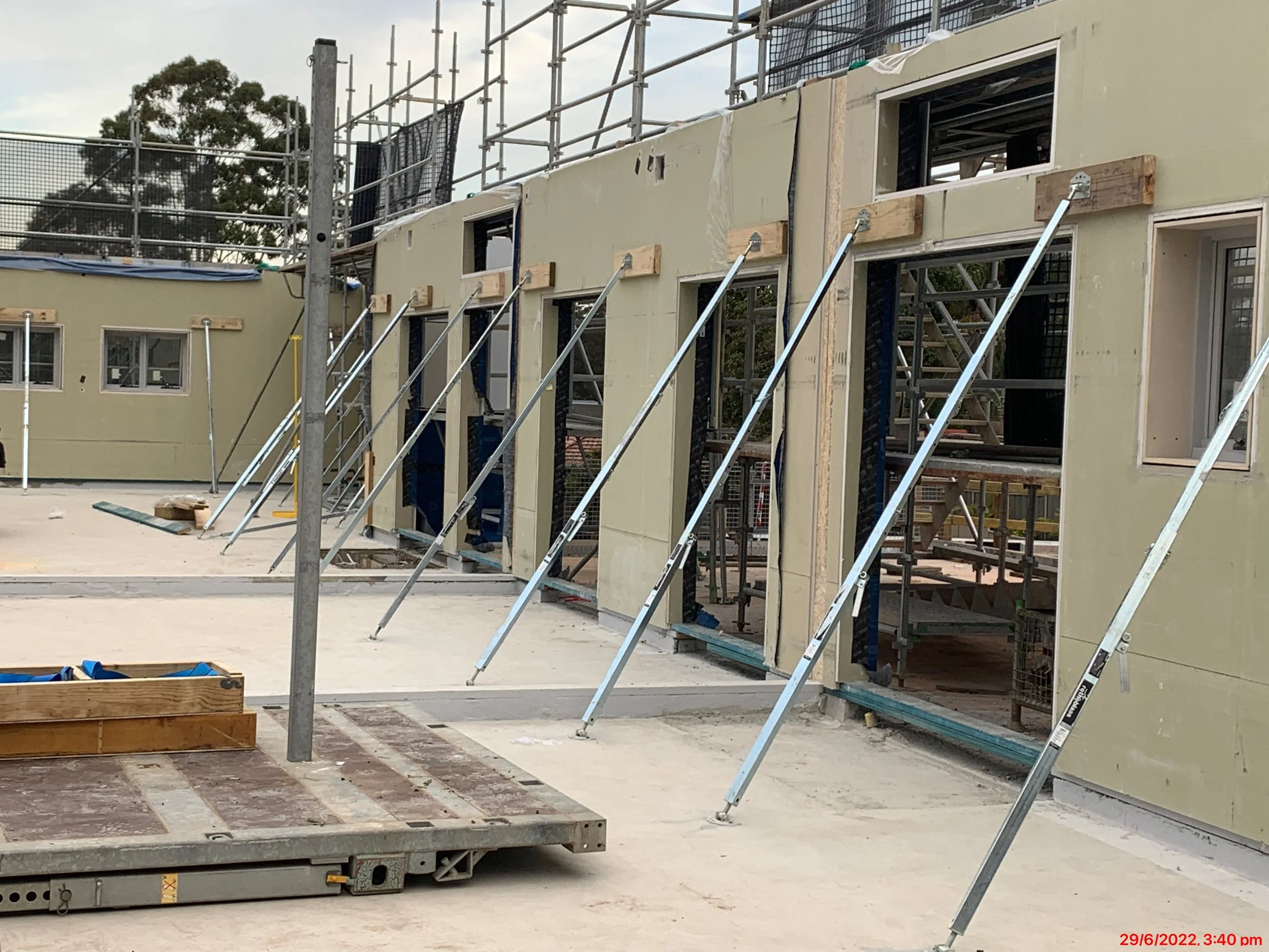 HD Group completed the construction of the entire structure by installing prefabricated timber framed and fibre cement cladded wall panels on a ground slab. Once the wall panel work had been completed, permanent formwork cassettes were installed on top of the walls and then filled with concrete to form the suspended slab. Another wall panel installation phase followed to complete the vertical structure for the second level after which we installed pitched composite roof cassettes.